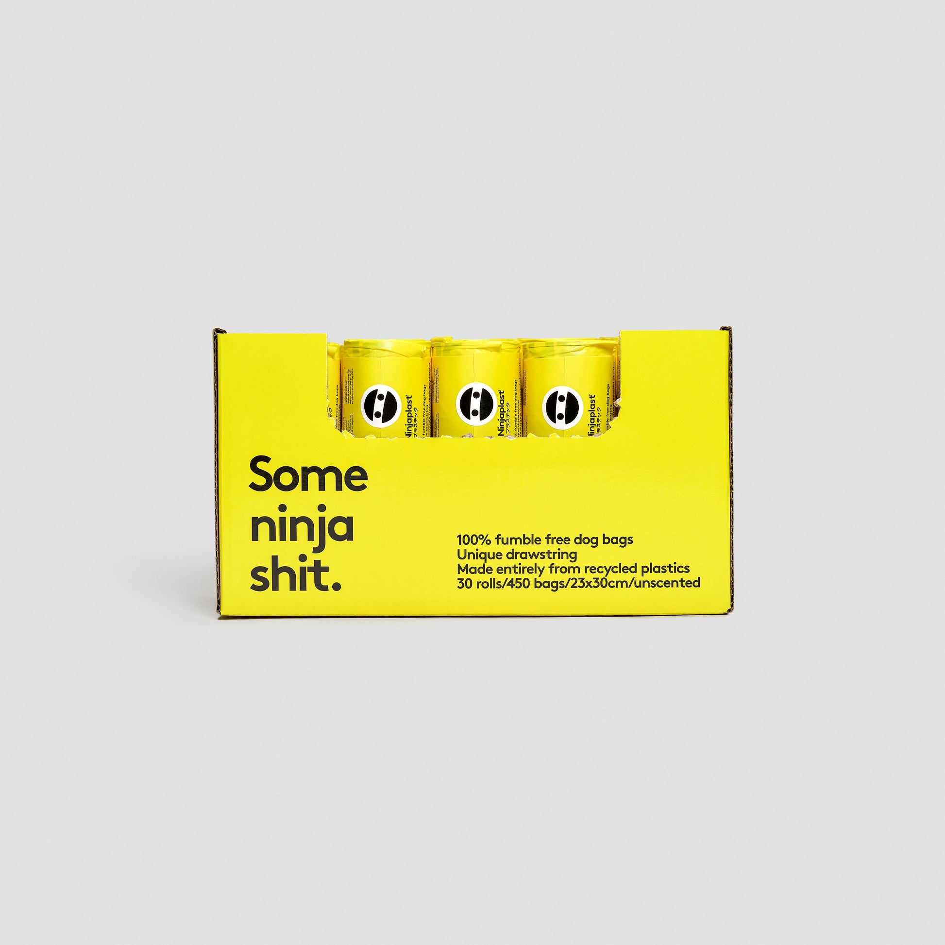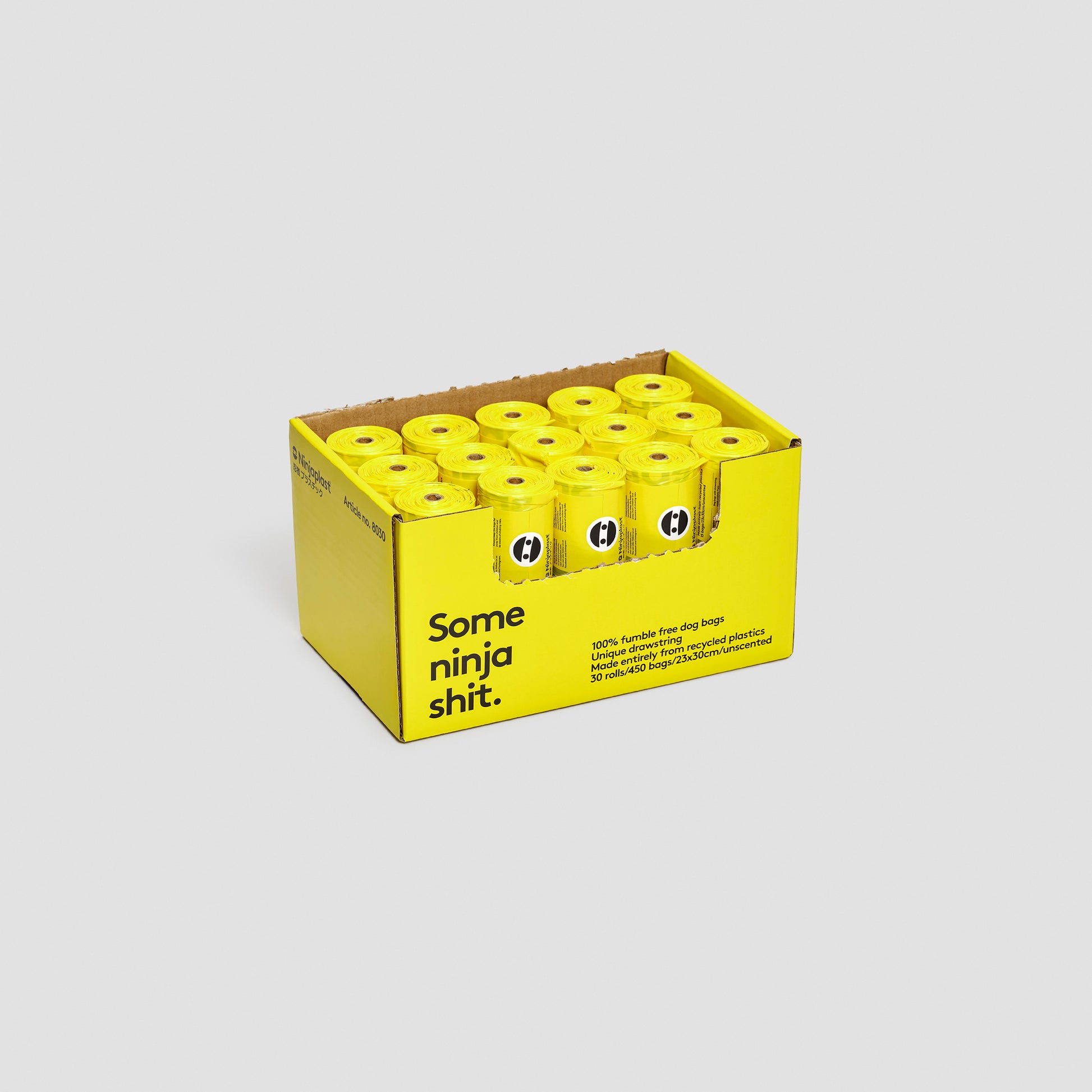 Ninjaplast hundbajspåsar med dragsnöre är slitstarka påsar utan doft. Ninjaplasts nya dragsnöres-konstruktion gör påsarna smidiga att försluta. Påsarna är tillverkade av återvunnen plast. Rullen innehåller 15 påsar.