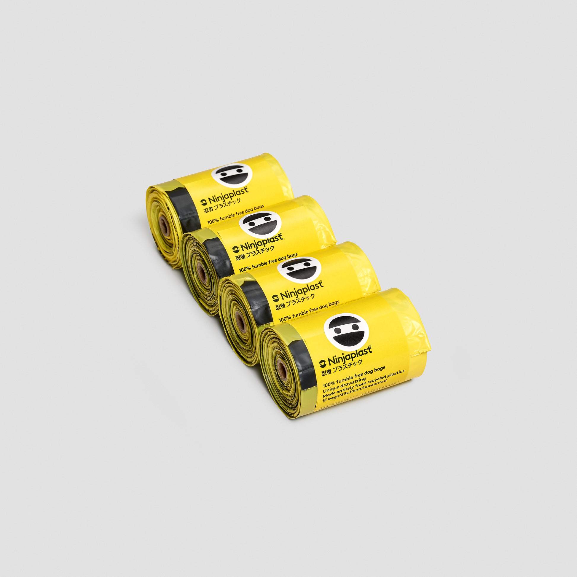 Ninjaplast hundbajspåsar med dragsnöre är slitstarka påsar utan doft. Ninjaplasts nya dragsnöres-konstruktion gör påsarna smidiga att försluta. Påsarna är tillverkade av återvunnen plast. En rulle innehåller 15 påsar.